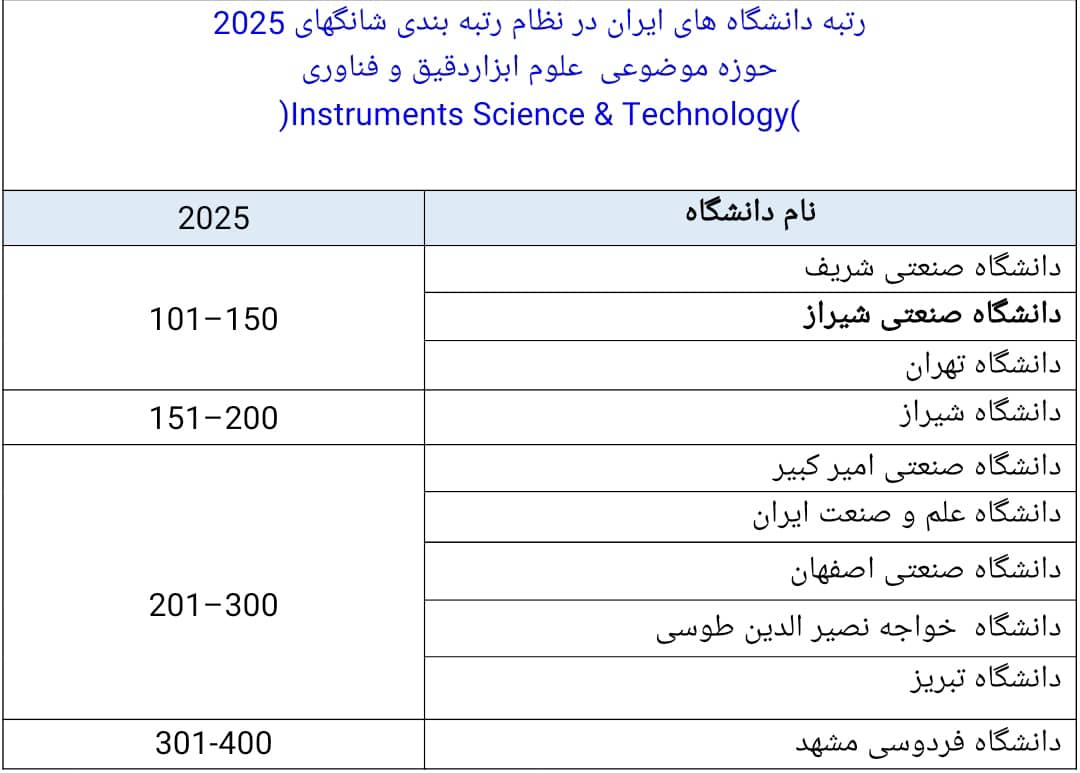 در نتایج سال 2025، در حوزه موضوعی علوم ابزاردقیق و فناوری 10دانشگاه از ایران حضور دارند که دانشگاه صنعتی شیراز توانست در این حوزه در بازه رتبه 150–101 جهانی قرار گیرد و همراه با دانشگاههای صنعتی شریف و تهران، مشترکاً رتبه اول ، دانشگاه شیراز در بازه رتبه 200-151 در رتبه دوم و دانشگاه صنعتی امیرکبیر، علم و صنعت ایران، صنعتی اصفهان، خواجه نصیرالدین طوسی و تبریز در بازه رتبه 300-201 رتبه سوم را کسب کنند.